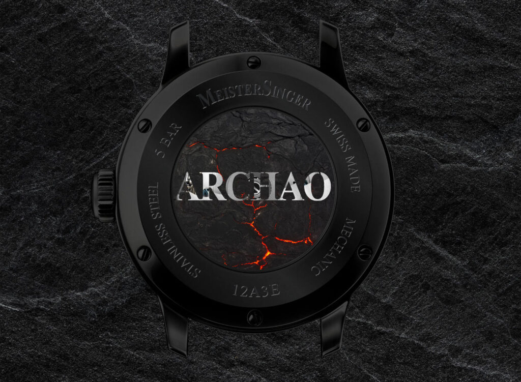 Angetrieben wird die „Archao“ vom Automatikkaliber Sellita SW 200. Das geschwärzte 43-Millimeter-Edelstahlgehäuse ist bis fünf bar wasserdicht und hat einen verschraubten Glasboden mit ungewöhnlichen, „archaischen“ Aufdruck, der an einen Vulkan denken lässt.