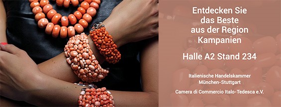 Auch 2026 wird die Region Kampanien erneut auf der INHORGENTA vertreten sein – mit einem Gemeinschaftsstand in Halle A2 („Elegance & Lifestyle“, Stand 234). Sieben Unternehmen präsentieren dort die Bandbreite der regionalen Produktion: Gaetano Vitiello, Mello Fulvio e C. S.A.S. (Mellogioielli), Medaglia Foto Srl (MyCharm), Crusado Srl, G. Robert Srl (Roberto Giannotti), Ditta D’Elia di Alfonso Vitiello und Carmine Saggese.