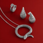 Schmuckdesignerin Sabine Müller verwandelt Silber und ausgewählte Edelsteine in fantastische kleine Kunstwerke, die man am Körper tragen kann. Die aktuelle Kollektion, „Snowy” von Sabine Müller, die man in Halle B2, Stand 364 bewundern kann, ist von winterlichen Landschaften inspiriert. Formen von Schnee- und Eiskristalle finden sich in den geometrischen Designs der Ringe und Ohrringe wieder. Die kantigen Formen der Ringe und Edelsteine erinnern an Eis, während die besondere Granulierung der Oberfläche das Bild von gefrorenem Schnee vor Augen ruft.
